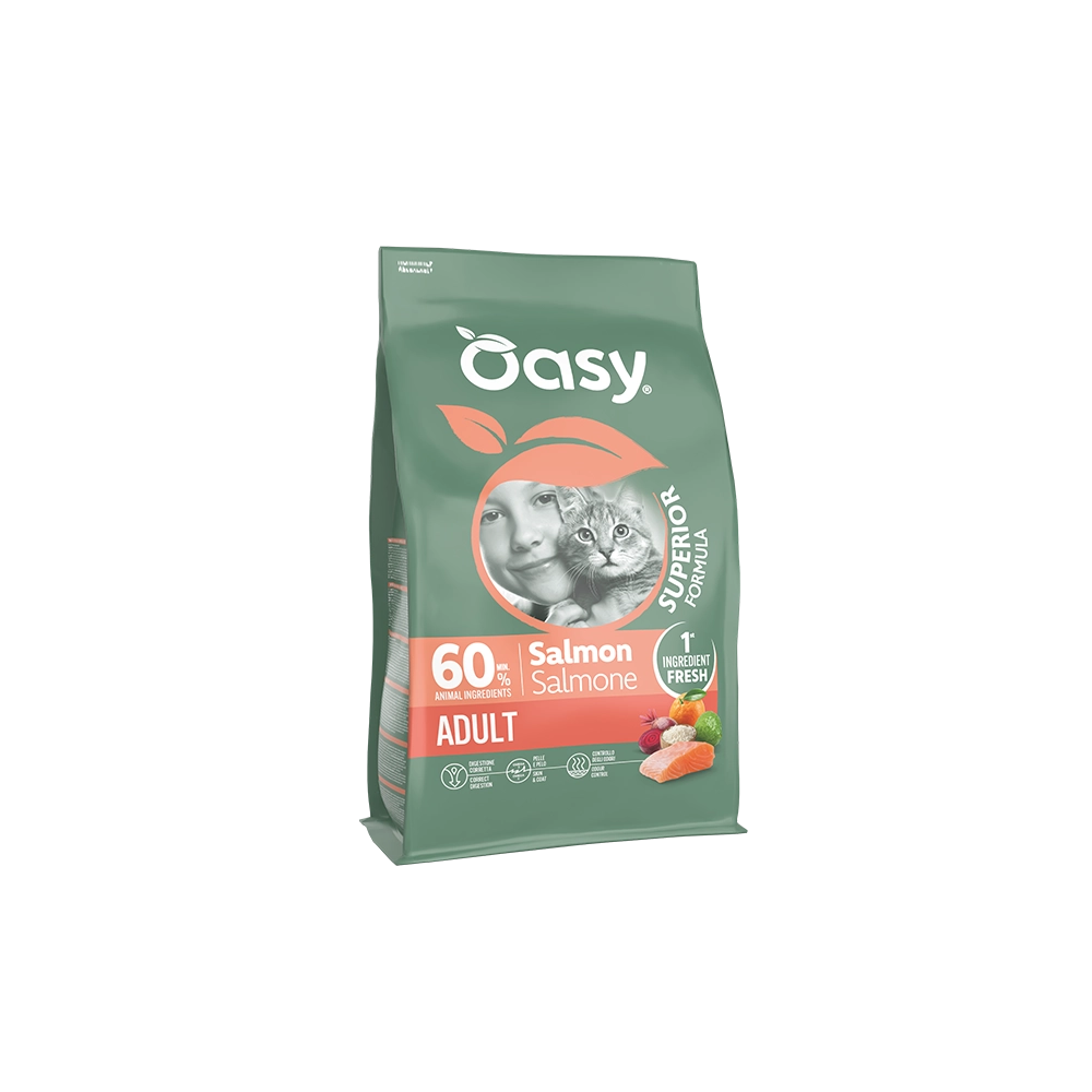 CARNE FRESCA: La carne fresca offre il massimo quanto a digeribilità, assimilazione dei nutrienti e gusto. Le sue proteine mantengono un eccellente valore biologico, i grassi contengono meno radicali liberi e viene assicurata una migliore conservazione delle vitamine. PELLE E PELO: L’apporto bilanciato di acidi grassi Omega-6 e -3 favorisce una pelle sana e un mantello folto e brillante. Gli acidi grassi Omega-6 e -3, infatti, sono nutrienti importanti per la rigenerazione del pelo e l’integrità della pelle del gatto. DIGESTIONE: L’Inulina è una fonte di prebiotici FOS (Fruttoligosaccaridi) che con i MOS (Mannanoligosaccaridi) favorisce un corretto equilibrio della flora batterica intestinale. La polpa di barbabietola è un’ottima fonte di fibre che contribuisce a migliorare la salute digestiva. CUORE: Oasy Adult Salmon contiene il corretto apporto di Taurina, un aminoacido essenziale per il funzionamento del cuore e per la corretta funzionalità della vista del gatto. Inoltre, la Taurina è importante per mantenere un buon tono muscolare per gatti attivi e vitali.