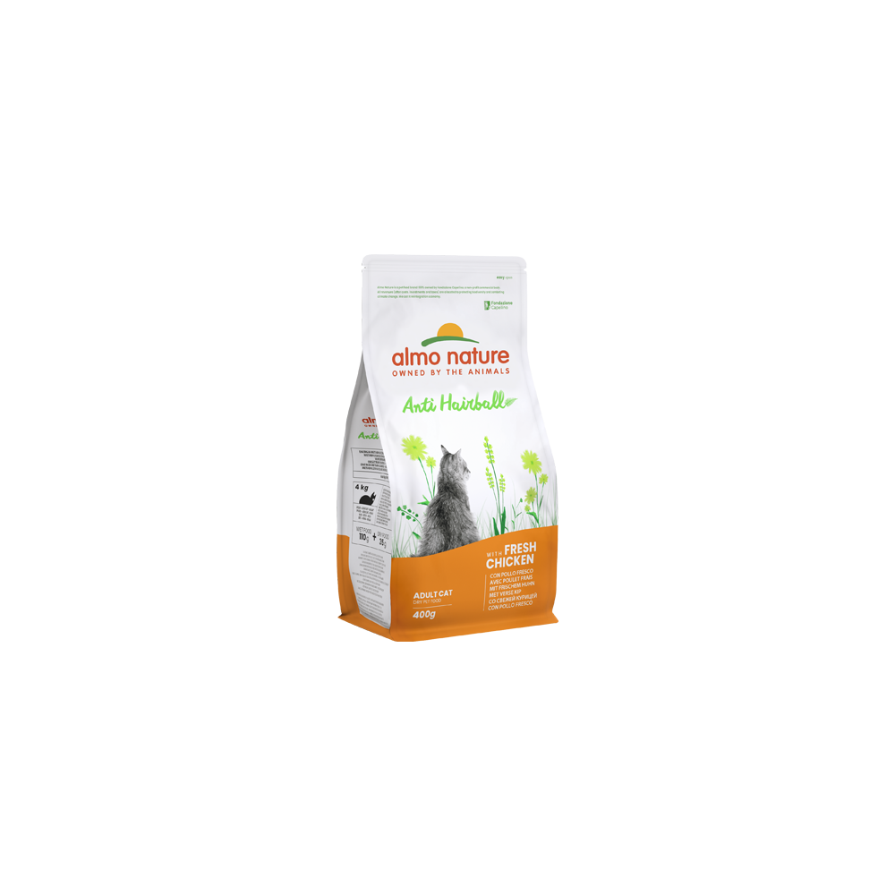 Alimento completo per gatti adulti, contiene fibre vegetali che aiutano a contrastare la formazione dei boli di pelo.