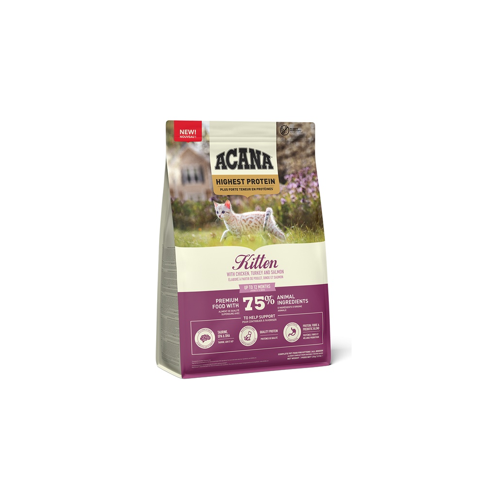 ACANA™ Highest Protein Kitten è l’alimento Acana per gattini dall’altissimo contenuto proteico! Formulato dai nostri veterinari e nutrizionisti per garantire un’alimentazione bilanciata, è la scelta ottimale per il Pet Lover che vuole nutrire il suo gattino in crescita con tante proteine animali: preparato nelle nostre pluripremiate cucine canadesi con i migliori ingredienti – tra cui pollo, tacchino e salmone freschi o crudi – e formulato senza cereali