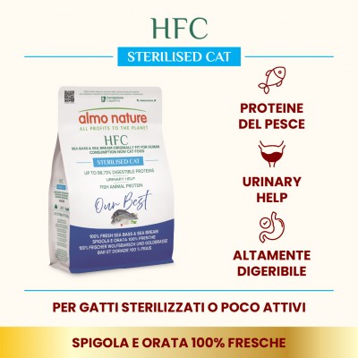 HFC Our Best Sterilised è la crocchetta pensata per il benessere dei gatti adulti e sterilizzati perché formulata con un basso contenuto di magnesio, per ridurre il rischio di formazione di cristalli di struvite e un equilibrio di grassi e fibre, per tenere il peso sotto controllo. La carne o il pesce 100% fresco come primo ingrediente garantiscono un’elevata digeribilità, Le crocchette apportano proteine digeribili fino al 98,73%, a beneficio del microbiota intestinale (Studio Dipartimento di Medicina Veterinaria Università di Teramo). I mirtilli rossi favoriscono, inoltre, la salute delle vie urinarie.