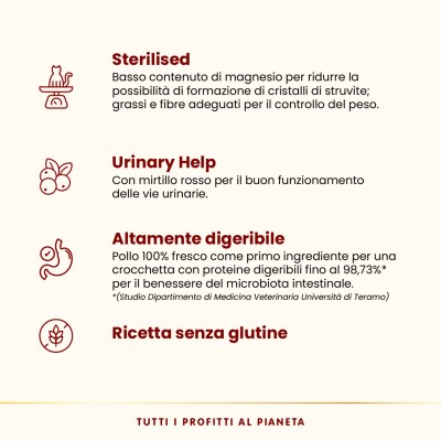 Ideali per i gatti sterilizzati: Le crocchette sono formulate per le esigenze dei gatti sterilizzati o poco attivi: un basso contenuto di magnesio per ridurre la possibilità di cristalli di struvite, un moderato contenuto in grassi e un adeguato apporto di fibre per aiutare il controllo del peso.
