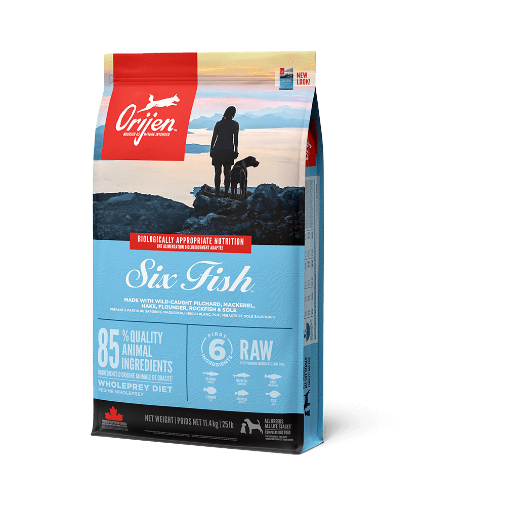 UN’IMPAREGGIABILE DIVERSITÀ DI PESCE FRESCO, INTERO E PESCATO IN NATURA PESCATO NELLE FREDDE ACQUE DEL PACIFICO DELL’ISOLA DI VANCOUVER. - Grazie al 38% di ricche e nutrienti proteine e al contenuto di carboidrati a basso indice glicemico limitato al 18%, ORIJEN SIX FISH fornisce ai cani in ogni fase di vita i nutrienti necessari per soddisfare le loro esigenze biologiche. -A differenza di qualunque altro alimento per cani, 2/3 del pesce di ORIJEN è FRESCO (refrigerato, senza conservanti) o CRUDO (congelato istantaneamente, senza conservanti), compresi i 6 principali tipi di pesce. -1/3 del pesce viene delicatamente disidratato a 90°C per creare una fonte ricca e concentrata di nutrienti proteine che non è ottenibile dal solo pesce fresco. -Le proporzioni della preda intera (WholePrey) di pesce fresco intero (con pesce, organi e cartilagine) apportano praticamente tutti i nutrienti di cui il tuo cane ha bisogno per crescere al meglio - limitando i supplementi a zinco e rame. -Le infusioni di fegato di merluzzo disidratato intensificano il sapore in modo naturale, rendendo così ORIJEN delizioso anche per i palati degli animali più esigenti. L’ALIMENTO DEL TUO CANE È BIOLOGICAMENTE APPROPRIATO? Proprio come i loro cugini selvatici, i cani si sono evoluti come cacciatori, quindi i loro denti, mandibole e apparati digerenti si sono adattati a diete ricche di ingredienti animali caratterizzate dalla freschezza e dalla diversità di questi ultimi. Gli alimenti Biologicamente Appropriati riproducono la dieta naturale.