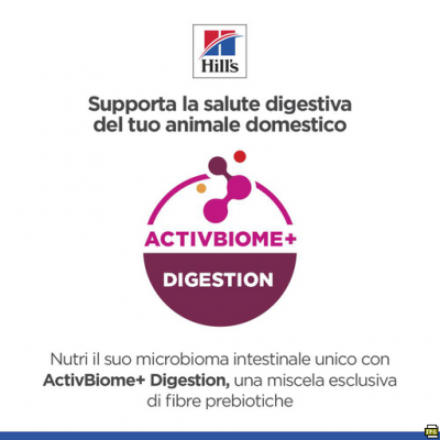 Contiene ActivBiome+, una miscela di prebiotici esclusiva di Hill's, che aiuta a nutrire ed equilibrare rapidamente il microbioma unico del tuo animale