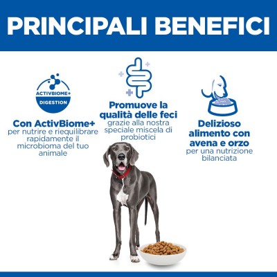Hill’s Science Plan Perfect Digestion Large Breed Adult Alimento per cani con pollo e riso integrale contiene ActivBiome+, un’esclusiva miscela di prebiotici Hill’s che aiuta a nutrire ed equilibrare rapidamente il microbioma unico del tuo animale.