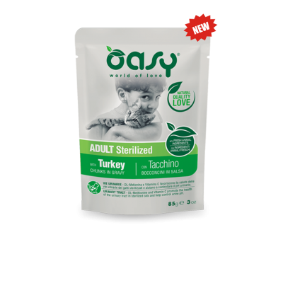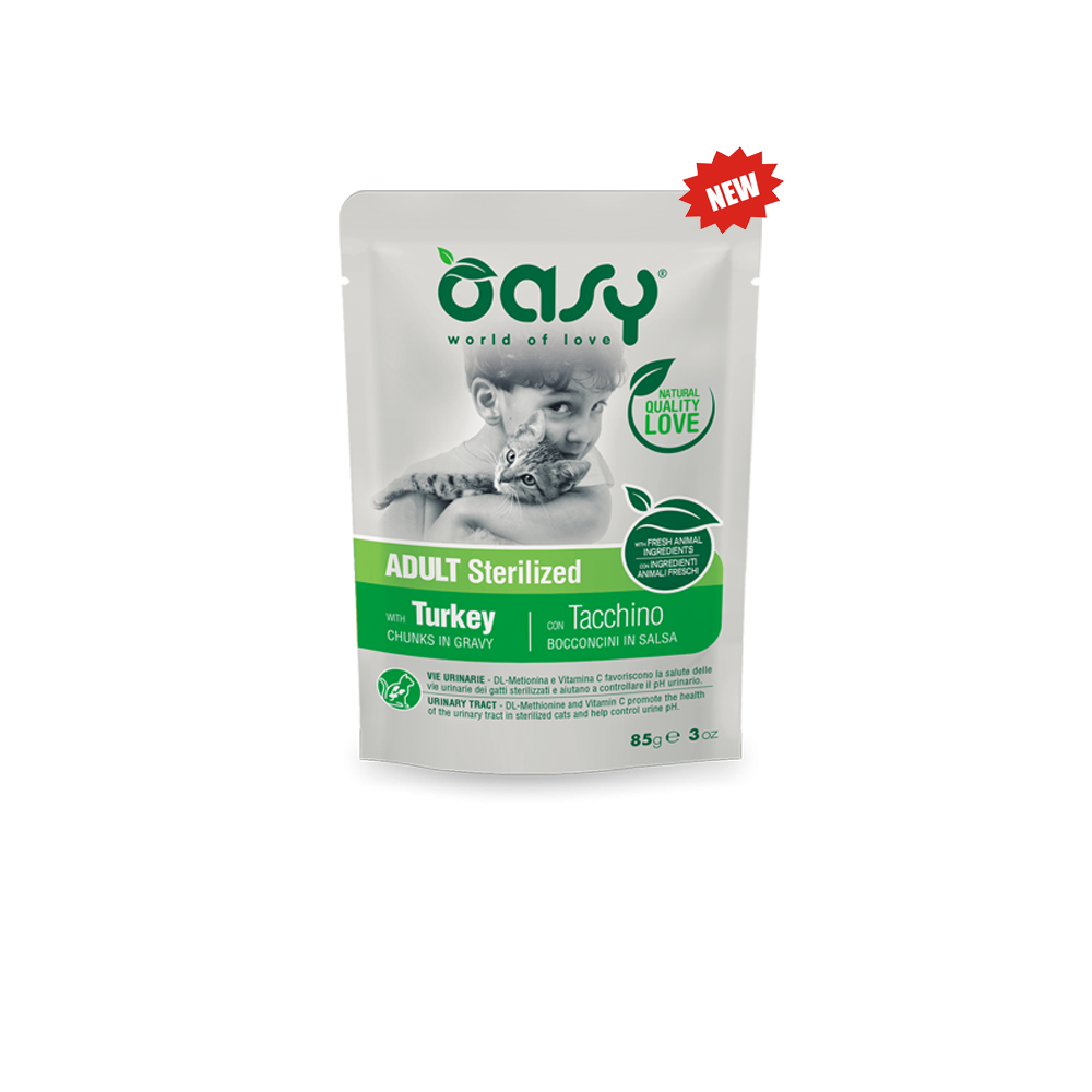 VIE URINARIE: DL-Metionina e Vitamina C favoriscono la salute delle vie urinarie dei gatti sterilizzati e aiutano a controllare il pH urinario. I teneri Bocconcini in salsa di Oasy sono alimenti completi formulati con carne fresca e con ingredienti naturali per garantire il massimo del gusto e soddisfare le esigenze specifiche del gatto in base ad età e stile di vita. Disponibili in 8 deliziose varianti prive di conservanti e coloranti artificiali, senza OGM e soia, e senza alcuna sperimentazione animale PRODOTTO SENZA GLUTINE.