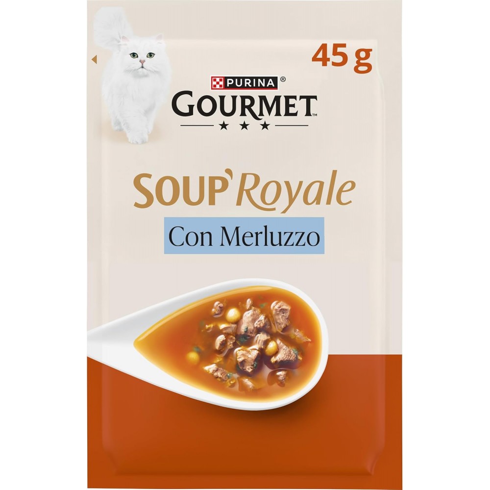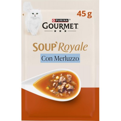 GOURMET Soup Royale è un momento di piacere che sorprende il palato raffinato del tuo gatto. In bustine da 45g monoporzione, in modo da avere il prodotto sempre fresco. Realizzato con ingredienti di alta qualità, alimento complementare da abbinare al pasto principale del tuo gatto. Delicati filettini, cotti in un delizioso brodo.