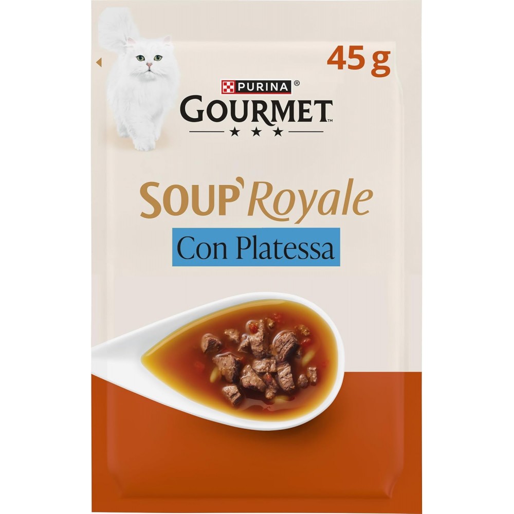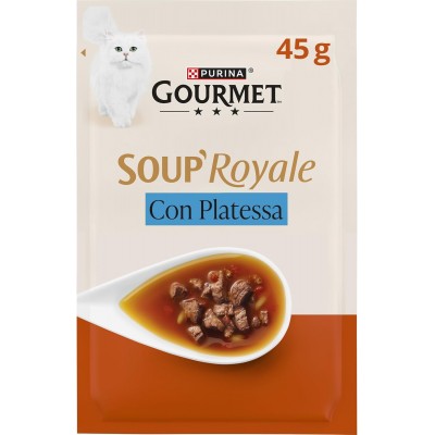 GOURMET Soup Royale è un momento di piacere che sorprende il palato raffinato del tuo gatto. In bustine da 45g monoporzione, in modo da avere il prodotto sempre fresco. Realizzato con ingredienti di alta qualità, alimento complementare da abbinare al pasto principale del tuo gatto. Delicati filettini, cotti in un delizioso brodo.