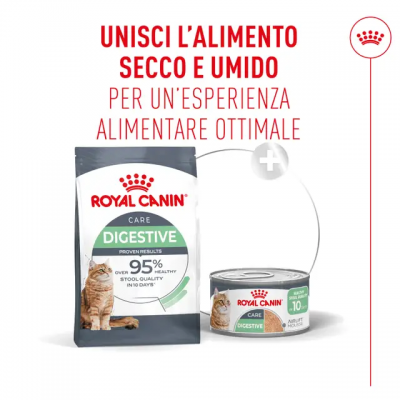 Integrare AirLift™ Mousse con l'alimento secco ROYAL CANIN® Digestive Care crea un programma nutrizionale bilanciato che favorisce la salute digestiva, l'idratazione e la varietà alimentare. Una qualità ottimale delle feci è raggiunta in 10 giorni* nei gatti nutriti con gli alimenti secchi e umidi ROYAL CANIN® Digestive Care.