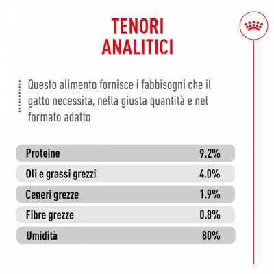 - ADDITIVI (per kg): Additivi nutrizionali: Vitamina D3: 120 UI, Taurina: 0,8 g, Ferro (3b103): 3 mg, Iodio (3b202): 0,27 mg, Rame (3b405, 3b406): 1,8 mg, Manganese (3b502, 3b503, 3b504): 0,9 mg, Zinco (3b603, 3b605, 3b606): 9 mg - Additivi tecnologici: Clinoptilolite di origine sedimentaria: 2 g - Additivi organolettici: Aromi.
