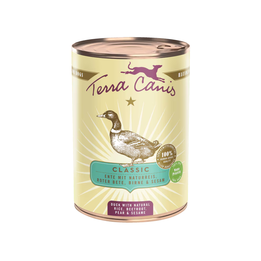 I menù Terra Canis CLASSIC contengono un’elevata percentuale di carne di muscolo (che comprende anche cuore e stomaco, che sono organi cavi muscolari), e a seconda del menù una ridotta quota di fegato ricco di sostanze nutritive e tanta sana verdura, frutta ed erbe aromatiche. A questi ingredienti vengono aggiunti unicamente pseudocereali ricchi di sostanze nutritive, facilmente digeribili e senza glutine (per es. miglio, amaranto e riso integrale) in quantità molto ridotta (4 – 10 %). Additivi naturali (alga marina, argilla, polline di fiore, rosa canina, sale delle Ande, lievito di birra) forniscono importanti vitamine, minerali ed oligoelementi. L'olio di colza fornisce preziosi acidi grassi essenziali e completa questi menu in modo ideale. Tutti gli ingredienti sono di qualità human-grade al 100 %. I menù sono adatti a tutti i cani adulti normopeso di qualsiasi razza.