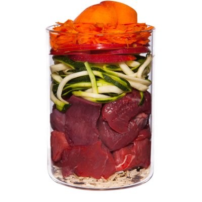 Manzo 46% (cuore di manzo 27%, fegato di manzo 6%, polmone di manzo 9%, muscolo di manzo 4% ), brodo 15%, carota 11%, zucchina 11%, mela 8%, riso integrale 5%, albicocca 3%, minerali 1%*, olio di colza, prezzemolo*, basilico*, seme di finocchio*, bucce di rosa canina*, argilla*, lievito di birra*, guscio d'ostrica*, spirulina* *essiccata/o
