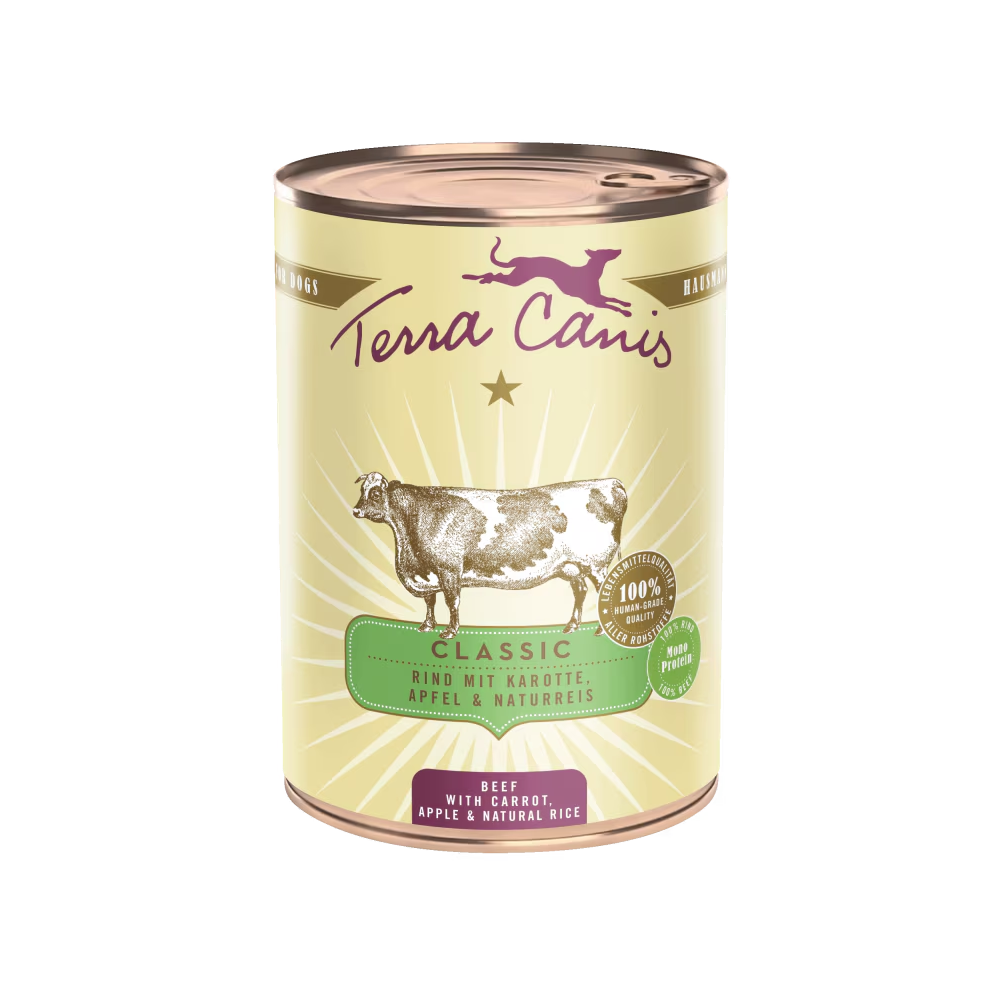 I menù Terra Canis CLASSIC contengono un’elevata percentuale di carne di muscolo (che comprende anche cuore e stomaco, che sono organi cavi muscolari), e a seconda del menù una ridotta quota di fegato ricco di sostanze nutritive e tanta sana verdura, frutta ed erbe aromatiche. A questi ingredienti vengono aggiunti unicamente pseudocereali ricchi di sostanze nutritive, facilmente digeribili e senza glutine (per es. miglio, amaranto e riso integrale) in quantità molto ridotta (4 – 10 %). Additivi naturali (alga marina, argilla, polline di fiore, rosa canina, sale delle Ande, lievito di birra) forniscono importanti vitamine, minerali ed oligoelementi. L'olio di colza fornisce preziosi acidi grassi essenziali e completa questi menu in modo ideale. Tutti gli ingredienti sono di qualità human-grade al 100 %. I menù sono adatti a tutti i cani adulti normopeso di qualsiasi razza.