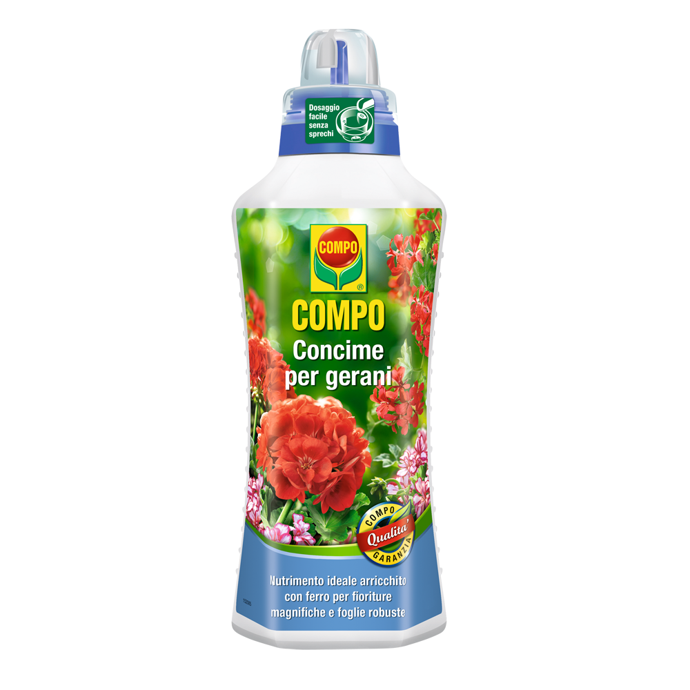 COMPO Concime per gerani è il concime liquido ideale per tutti i gerani in vaso e in piena terra. La sua speciale formulazione ad elevato contenuto di Ferro facilita la fotosintesi impedendo l’ingiallimento delle foglie (Clorosi) e irrobustisce la struttura della pianta, favorendo una crescita forte e rigogliosa della parte aerea e radicale. Garantisce inoltre una fioritura abbondante dai colori intensi e brillanti.