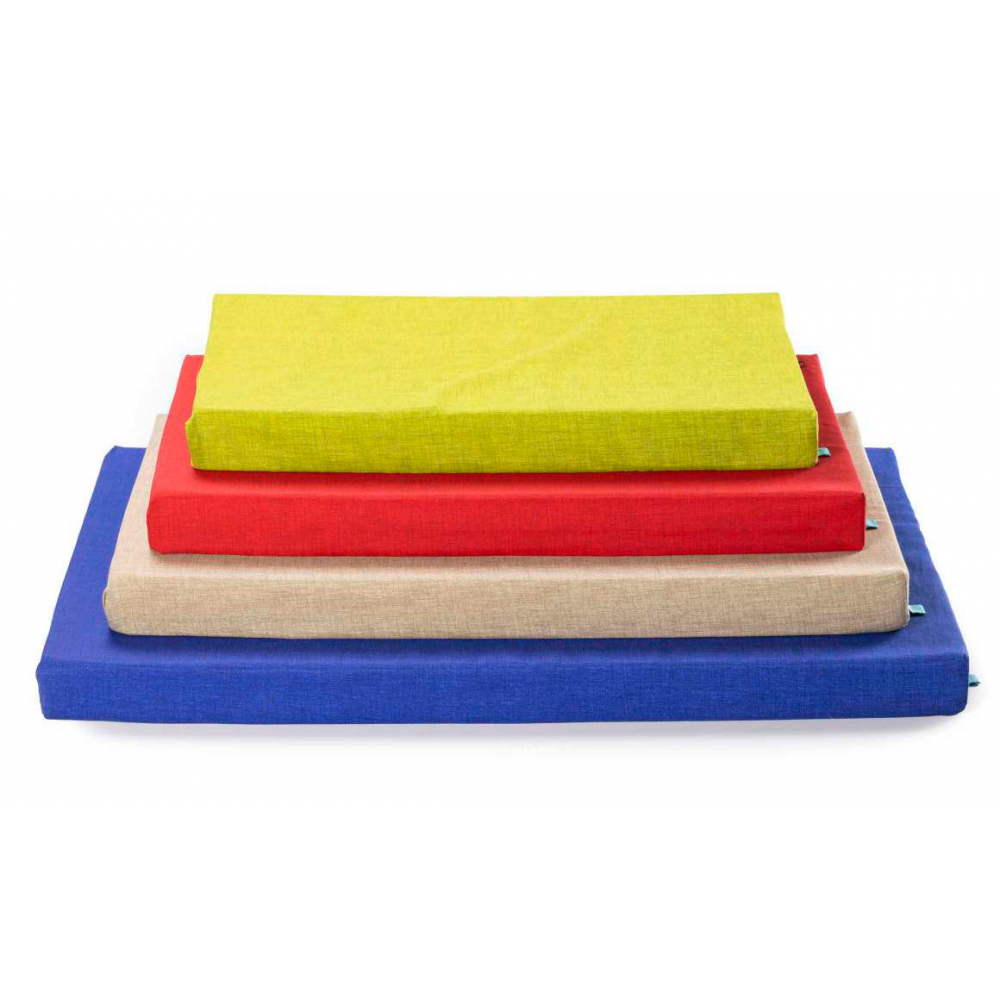 Materassino SFODERABILE tinte unite assortite con interno in gomma piuma, spessore 8 cm, base in TNT. Assorted solid colours mattress, with inner foam and REMOVABLE COVER, 8 cm thick, TNT base.