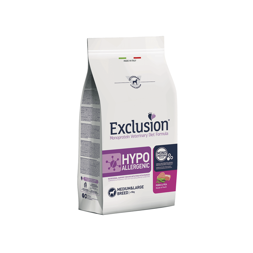 Alimento completo dietetico con formulazione monoproteica animale per cani con intolleranza alimentare. Exclusion Monoprotein Veterinary Formula Hypoallergenic è una linea completa di alimenti dietetici con formulazione monoproteica e monocarboidrato, realizzata con fonti alternative di proteine, ingredienti innovativi, grain free e preservata con tocoferoli naturali; rappresenta la risposta nutrizionale a disposizione del Veterinario, differenziata per taglia e nella versione secco e umido, specifica per il trattamento delle intolleranze alimentari.