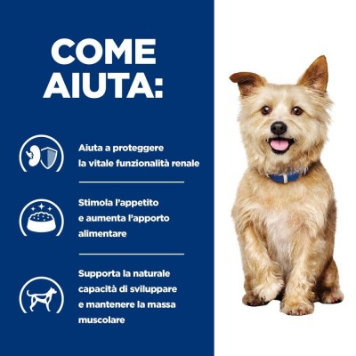 loro di funzionare in modo più efficace. I cani con ridotta funzionalità renale possono manifestare perdita di appetito e l'assunzione di alimento potrebbe diminuire.I nutrizionisti e i veterinari di Hill's hanno sviluppato la nutrizione clinica Hill's Prescription Diet k/d con ActivBiome+ Kidney Defense, una miscela brevettata di prebiotici che ha dimostrato di nutrire il microbioma intestinale per aiutare a sostenere la funzione renale. Prescription Diet k/d è inoltre formulato con Enhanced Appetite Trigger (E.A.T) per stimolare l'appetito e favorire l'assunzione di alimento. Questo alimento secco e ha un gusto irresistibile che il tuo cane adorerà. In effetti, Prescription Diet k/d è un alimento clinicamente testato per migliorare e allungare la qualità della vita.