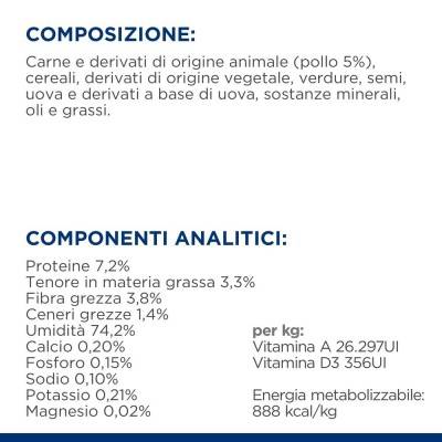 Anche un leggero sovrappeso, può condizionare la qualità di vita del tuo cane e le relazioni all'interno della famiglia, poichè un peso extra può limitare il gioco, influenzare la mobilità e alterare la salute generale. Mantenere il peso ideale può aiutare a determinare le aspettative di vita, riducendo il rischio delle patologie associate a problemi di peso.I nutrizionisti e i veterinari di Hill's hanno sviluppato Prescription Diet Metabolic, una nutrizione clinica appositamente formulata per aiutare i cani a perdere peso e mantenere il peso perso. Funziona naturalmente con l'uso di energia unica del tuo cane per una perdita di peso facile ed efficace. Questo alimento stimola la naturale capacità dei cani di bruciare i grassi e fornisce energia per il gioco attivo. La sua miscela di fibre unica aiuta a mantenere i cani pieni e soddisfatti. Infatti, il 96% dei cani ha perso peso a casa in 2 mesi se nutrito con Prescription Diet Metabolic. * Questo alimento umido per cani è fatto con pollo e ha un gusto irresistibile che il tuo cane adorerà.È importante continuare a nutrire con l'alimento per cani Prescription Diet Metabolic per aiutare a gestire il peso del tuo cane, anche dopo che ha raggiunto il suo peso ideale. Controlli regolari con il veterinario sono essenziali per assicurarti che il tuo cane rimanga in buona salute.Un'alimentazione dall'ottimo sapore che aiuta a trasformare la vita del tuo animale domestico. Poiché dipendono da te, ci sforziamo di fornire la migliore alimentazione umanamente possibile. Con formule scientifiche per soddisfare le esigenze di salute uniche del tuo cane, il cibo per cani Prescription diet è la nutrizione mirata di cui hanno bisogno per vivere una vita lunga e felice.Produciamo i nostri alimenti per animali domestici con ingredienti di altissima qualità. Questi ingredienti devono soddisfare i nostri severi requisiti di purezza e contenuto di nutrienti.Puoi fare la differenza nella vita degli animali domestici nei rifugi. Con ogni acquisto di alimenti Hill's prescription diet, contribuisci a nutrire oltre 100.000 animali domestici senza casa ogni giorno, 365 giorni all'anno. Scopri di più su hillsfoodshelterlove.com.L'alimento per cani Prescription Diet di Hill's è disponibile in una varietà di alimenti secchi per le esigenze specifiche del tuo cane e alimenti umidi in molti deliziosi gusti che il tuo cane adorerà.* Dati in archivio, Hill’s Pet Nutrition, Inc.