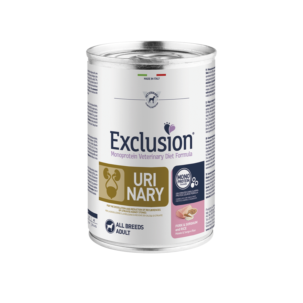 Exclusion Monoprotein Veterinary Diet Formula Urinary è un alimento dietetico con formulazione monoproteica, realizzato con un’unica fonte alternativa di proteine animali, ingredienti innovativi e preservato con tocoferoli naturali; rappresenta la risposta nutrizionale a disposizione del Veterinario, differenziata per taglia, come supporto nutrizionale per la dissoluzione e la riduzione di recidive dei calcoli di struvite.