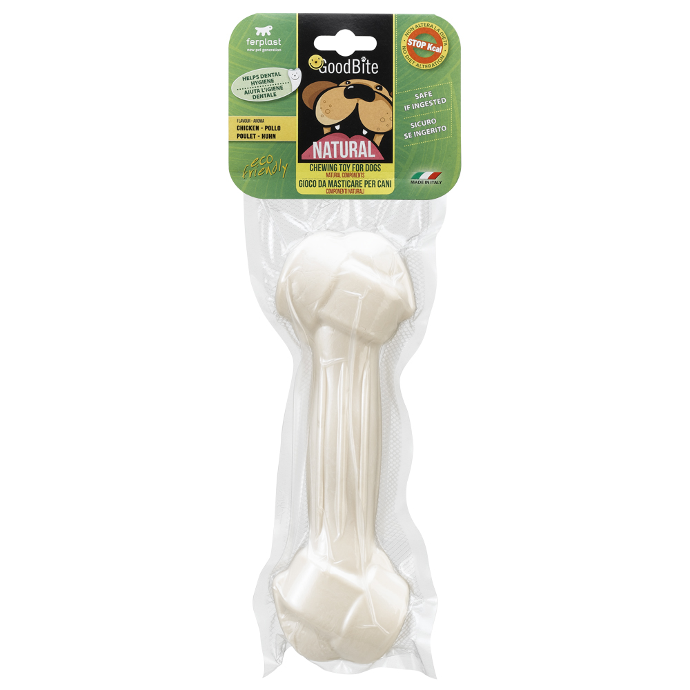 Il gioco da masticare per cani GoodBite Natural Chicken Bone, dal delicato aroma di pollo, è disponibile in 6 diversi formati: XS in confezione da 4 ossi da 15 grammi l'uno, S in confezione da due ossi da 40 grammi l'uno, M in confezione da due ossi da 70 grammi l'uno. I formati più grandi L, XL e XXL sono invece disponibili in confezione da un osso da 140, 250 e 420 grammi.