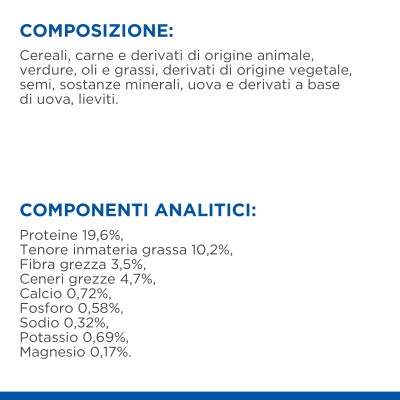 - Proteine 22.0%; Grassi 11.2%; Fibra Grezza 3.8%; Carboidrati (NFE) 58.8%;Calcio 0.46%; Fosforo 0.48%; Sodio 0.35%; Potassio 0.76%; Magnesio 0.183%; Taurina 0.05%; L-carnitina 21.2 ppm; Vitamina C 15 ppm; Vitamina E 77 IU/kg; Acidi grassi Omega-3 15.93%; Ceneri Grezze 4.3%; Beta-carotene 0.16 ppm; L-lisina 1.16%; Fibra alimentare totale 12.2%; Vitamina D 20 IU/kg.