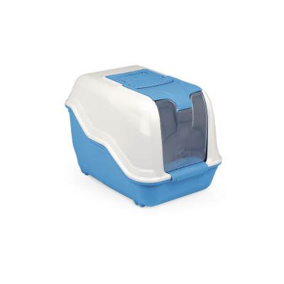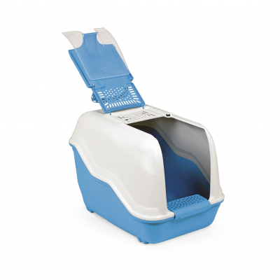 Il coperchio bicolore è fissato stabilmente alla vaschetta per mezzo di due clip. La parte anteriore del coperchio e la porta basculante possono essere sollevati verso l’alto, consentendo un facile accesso per il vostro gatto e facilitando le operazioni di pulizia.